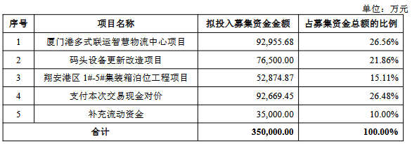 本次发行股份募集配套资金扣除中介机构费用后,拟用于标的公司相关项目建设、支付本次交易现金对价和补充流动资金,具体如下:厦门港多式联运智慧物流中心项目、码头设备更新改造项目、翔安港区1#-5#集装箱泊位工程项目、支付本次交易现金对价、补充流动资金。